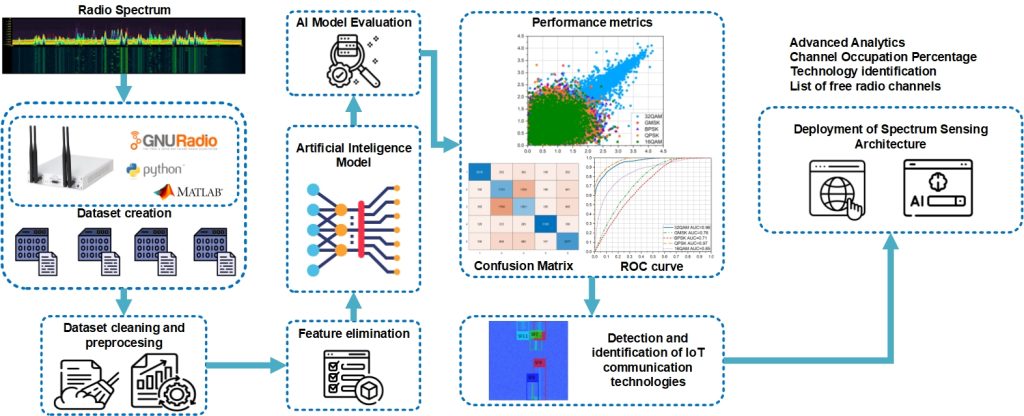 - O2: The second objective is the training and validation of the developed AI algorithms that will be able to classify different IoT technologies (e.g. LoRa, SigFox). This objective also entails the entails the deep learning algorithm design where different configuration and neural networks will be analyzed and evaluated.